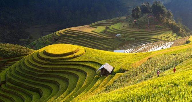 A remote mountainous district where some of Vietnam’s most stunning rice terraces glow in shades of gold during harvest season.